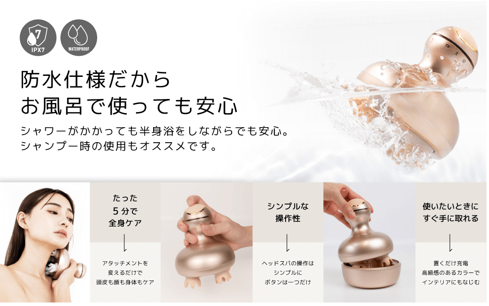 これらのアタッチメントは、お好みやケアの目的に応じて使い分けることができます。頭皮、髪、フェイスのケアに幅広く対応し、快適なヘッドスパ体験を提供します。
