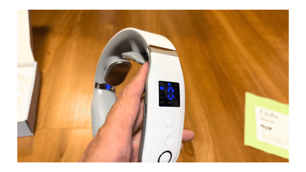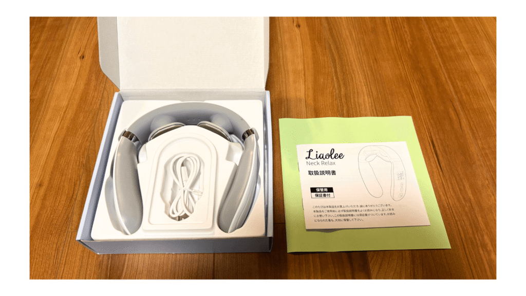 付属品を確認しながら一つずつ取り出し、本体を手に取ると、首元にフィットしそうな形状と程よい重さが感じられました。使用前から、首や肩の疲れが和らぎそうな期待が高まり、早く試してみたい気持ちになります。